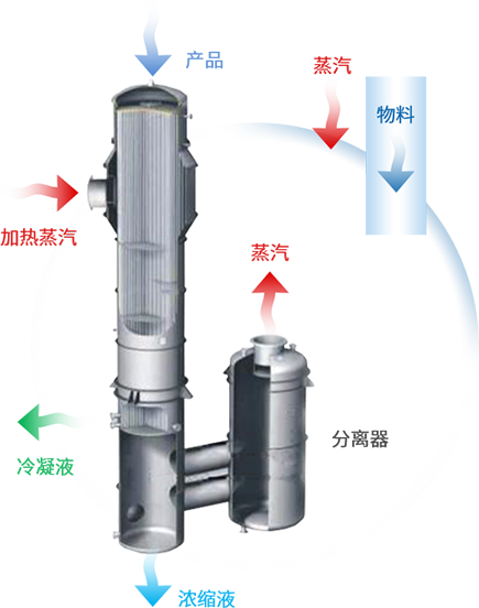 降膜蒸發(fā)器,具有濃縮比大、粘度范圍寬、壓降小、傳熱效果好、處理量大等優(yōu)點。在乙二醇、乙醇胺、己內酰胺、苯乙烯、烷基苯酚、腈綸、滌綸、氯堿、聚碳酸脂、水處理等石油化工裝置及輕工、食品行業(yè)有廣泛的應用。