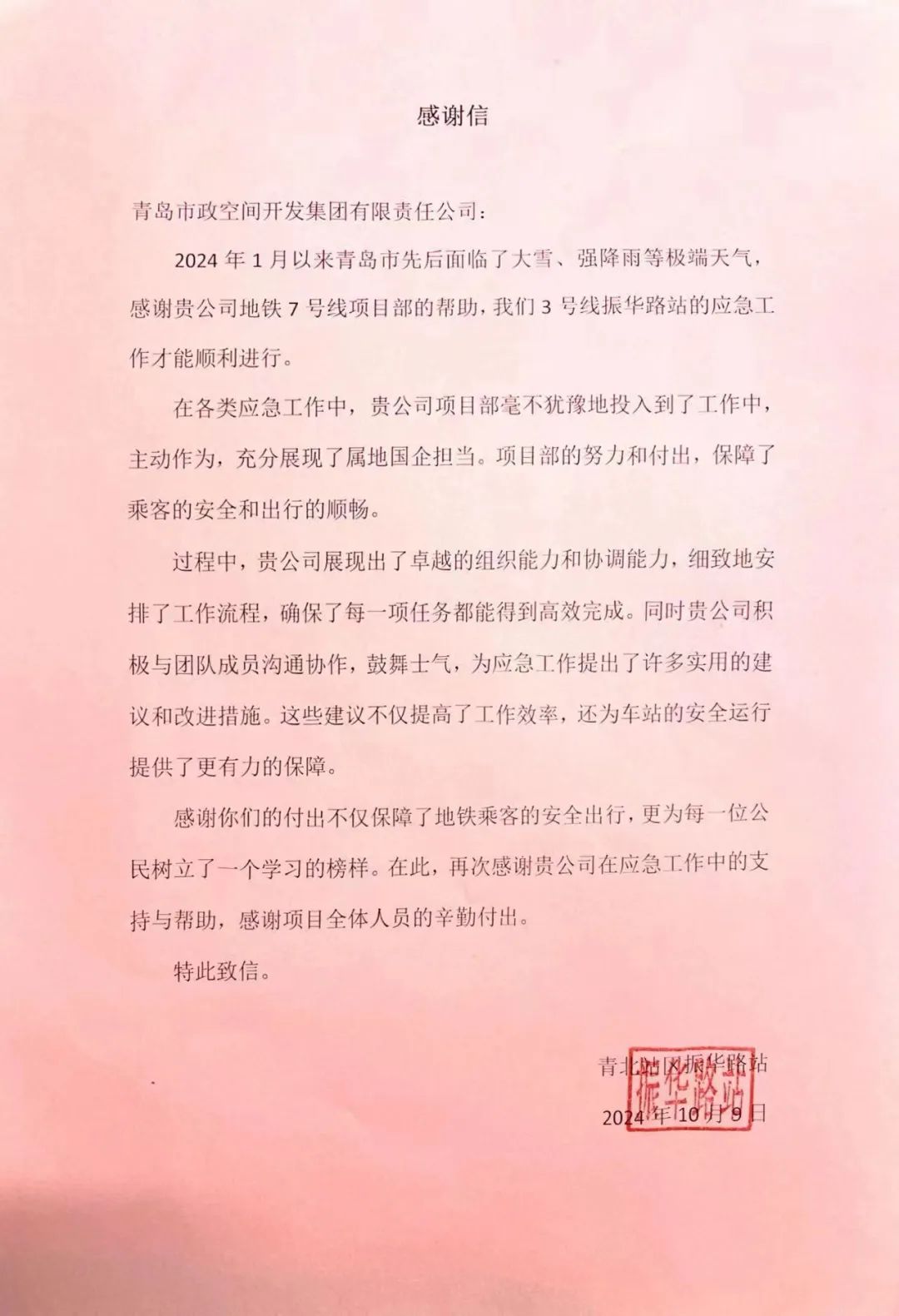 城軌公司收到來自青島地鐵運營公司發(fā)來的感謝信