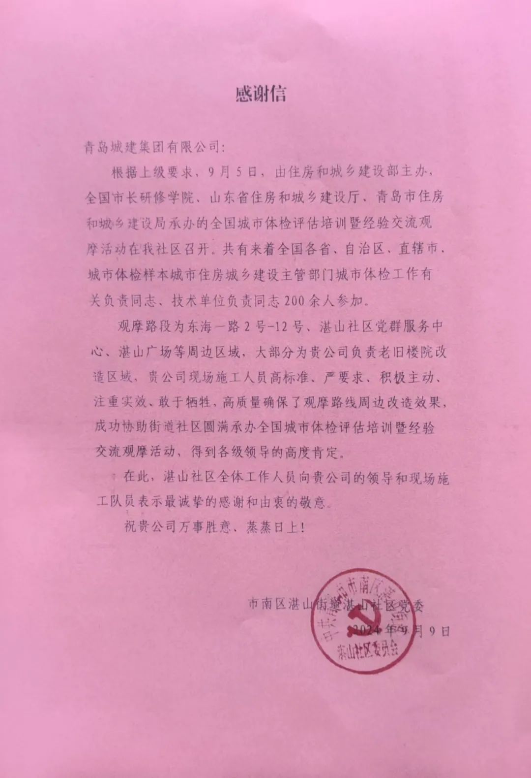 喜報(bào)!一封來(lái)自青島市市南區(qū)湛山街道湛山社區(qū)的感謝信
