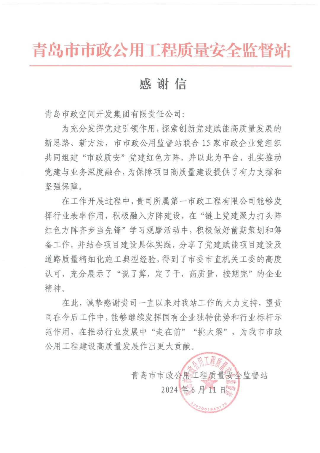 一封來(lái)自青島市市政公用工程質(zhì)量安全監(jiān)督站的感謝信