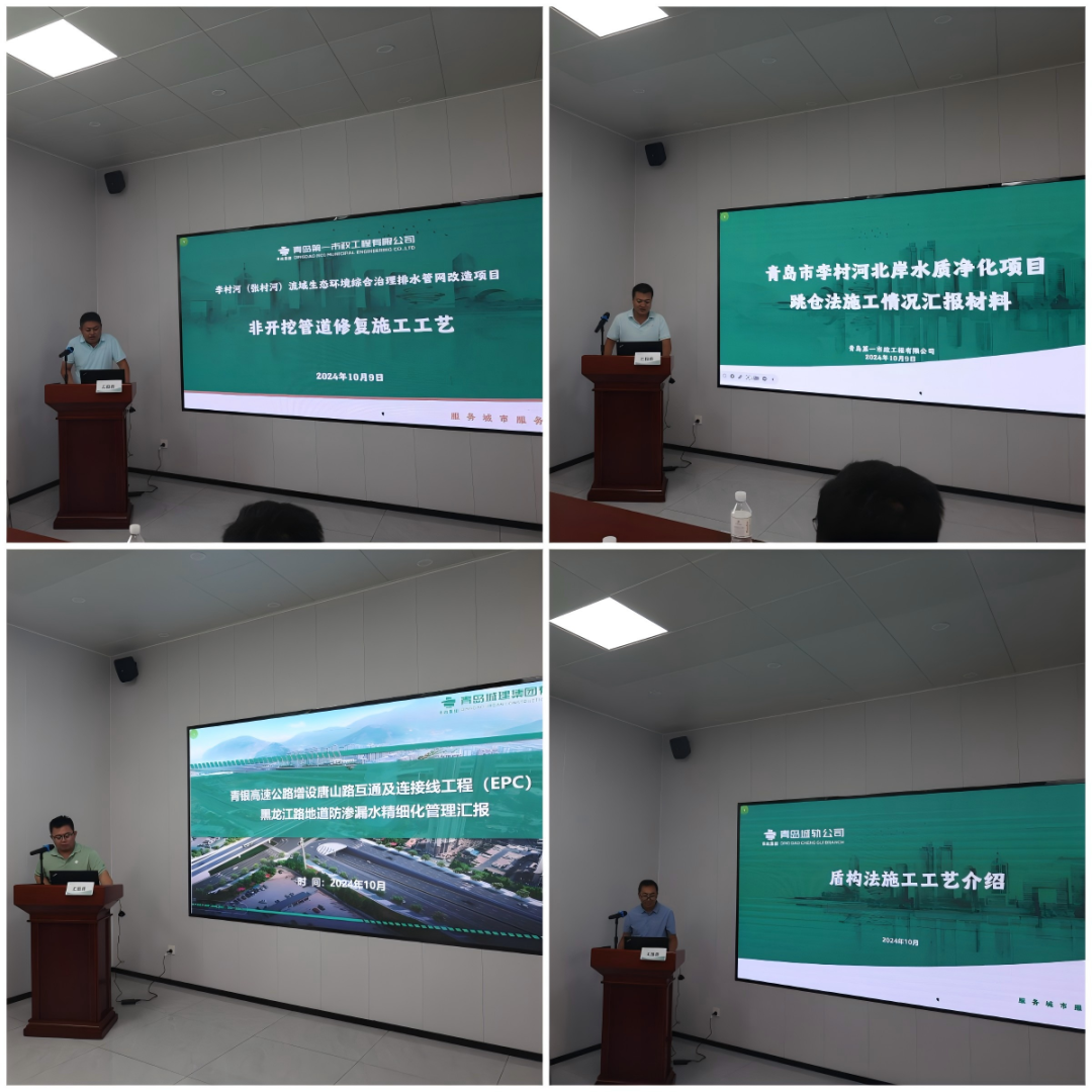 成果交流環(huán)節(jié),各單位代表逐一進行了匯報。第一市政兩河流域項目副經(jīng)理仝西亞詳解了CIPP紫外光固化與碎管法兩項非開挖修復技術,并分享了標準化施工工藝要點;李村河北岸項目總工崔海洋匯報了項目部積極探索施工新方法的成功案例,通過采用跳倉法等創(chuàng)新方案,成功優(yōu)化施工、縮短工期、提升質量;城建公司唐山路地下通道項目總工侯繼濤以《地道防滲漏水精細化質量管理》為主題,講解了地道工程防滲漏質量控制措施;城軌公司盾構項目部經(jīng)理于文龍展示了盾構施工工藝的發(fā)展歷程、國內(nèi)應用及盾構機構造,通過案例與數(shù)據(jù),讓參會者深刻體驗盾構施工。各參會單位領導對此次活動進行了發(fā)言,均表示通過此次活動得以對標先進、深入學習、取長補短,拓寬了質量管理工作的視野。