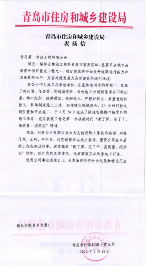 近日,第一市政公司收到了一封來自青島市住房和城鄉(xiāng)建設(shè)局的表揚(yáng)信。信中對(duì)第一市政公司順利完成延安一路綜合整治工程任務(wù)給予充分肯定。對(duì)他們?cè)谑┕み^程克服諸多不利因素,科學(xué)統(tǒng)籌組織,全面保障工程高效推進(jìn)的做法提出表揚(yáng)。希望他們繼續(xù)發(fā)揚(yáng)“說了算、定了干、高質(zhì)量、按期完”的企業(yè)精神,以扎實(shí)的工作作風(fēng),優(yōu)質(zhì)高效完成剩余施工任務(wù)。