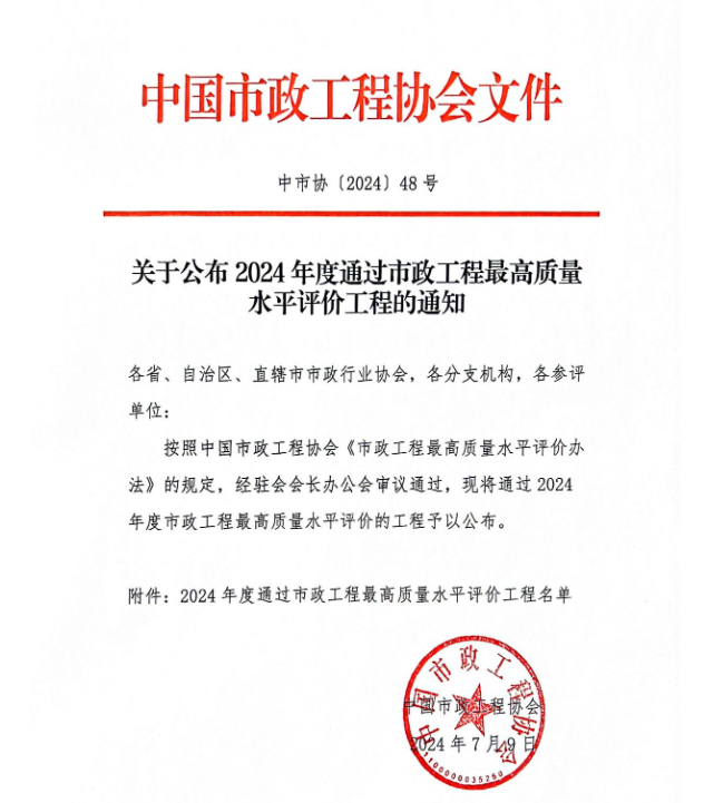 近日,中國市政工程協(xié)會公示《2024年度通過市政工程最高質(zhì)量水平評價》工程的獲獎名單,由第一市政施工建設(shè)的高新區(qū)經(jīng)二路(前海路至豐和路)道路及綜合配套工程赫然在列,該獎項是市政工程行業(yè)在工程質(zhì)量方面最高的質(zhì)量水平評價,代表市政工程行業(yè)同時期國內(nèi)先進(jìn)水平,充分彰顯了市政集團(tuán)在市政建設(shè)領(lǐng)域的專業(yè)水準(zhǔn)。