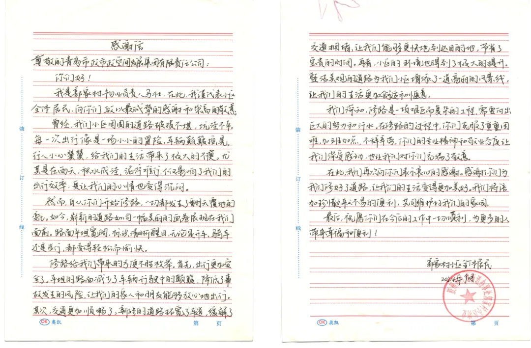 信中指出改建前的文化路周圍道路破損不堪、坑洼不平、出行顛簸、雨季更是積水成洼、泥濘難行,給居民出行帶來了極大的安全隱患。然而自項(xiàng)目部進(jìn)場(chǎng)之后,一切都發(fā)生了變化。如今嶄新的道路、平坦的路面不僅緩解了交通的擁堵,還提升了小區(qū)的環(huán)境,讓周邊居民的出行都變得輕松而愉快……