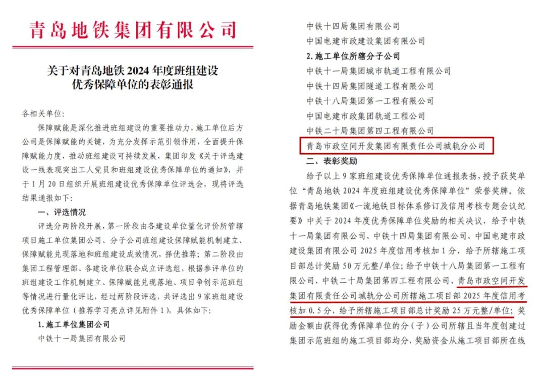 2月8日,市住建局通報(bào)表?yè)P(yáng)2024年度市政公用工程領(lǐng)域班組建設(shè)表現(xiàn)突出單位,城軌公司赫然在列;2月10日,城軌公司作為唯一一家非央企企業(yè)獲評(píng)“青島地鐵2024年度班組建設(shè)優(yōu)秀保障單位”(共6家)。